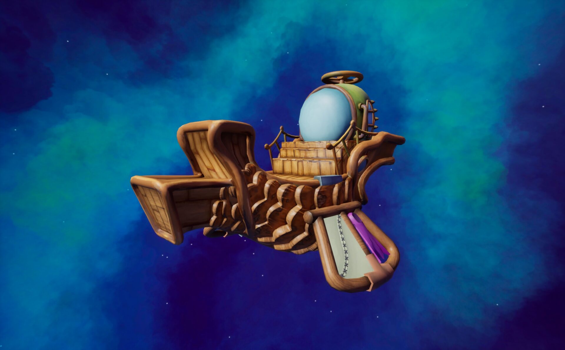 A patched-up but lively ship, all orange and yellow in the image of Solan’s concept art, and the soft palette used for the rest of the universe. “Even though the colours contrast with the blue of the space surrounding the ship, we wanted the Void Fisher to be completely in tune with its surroundings.