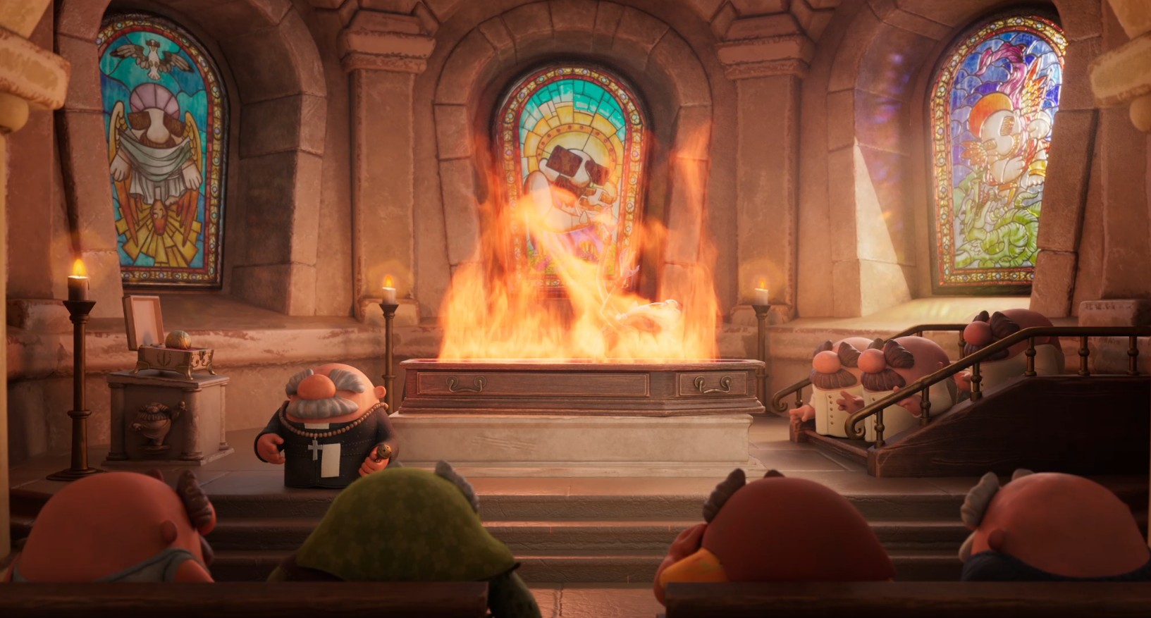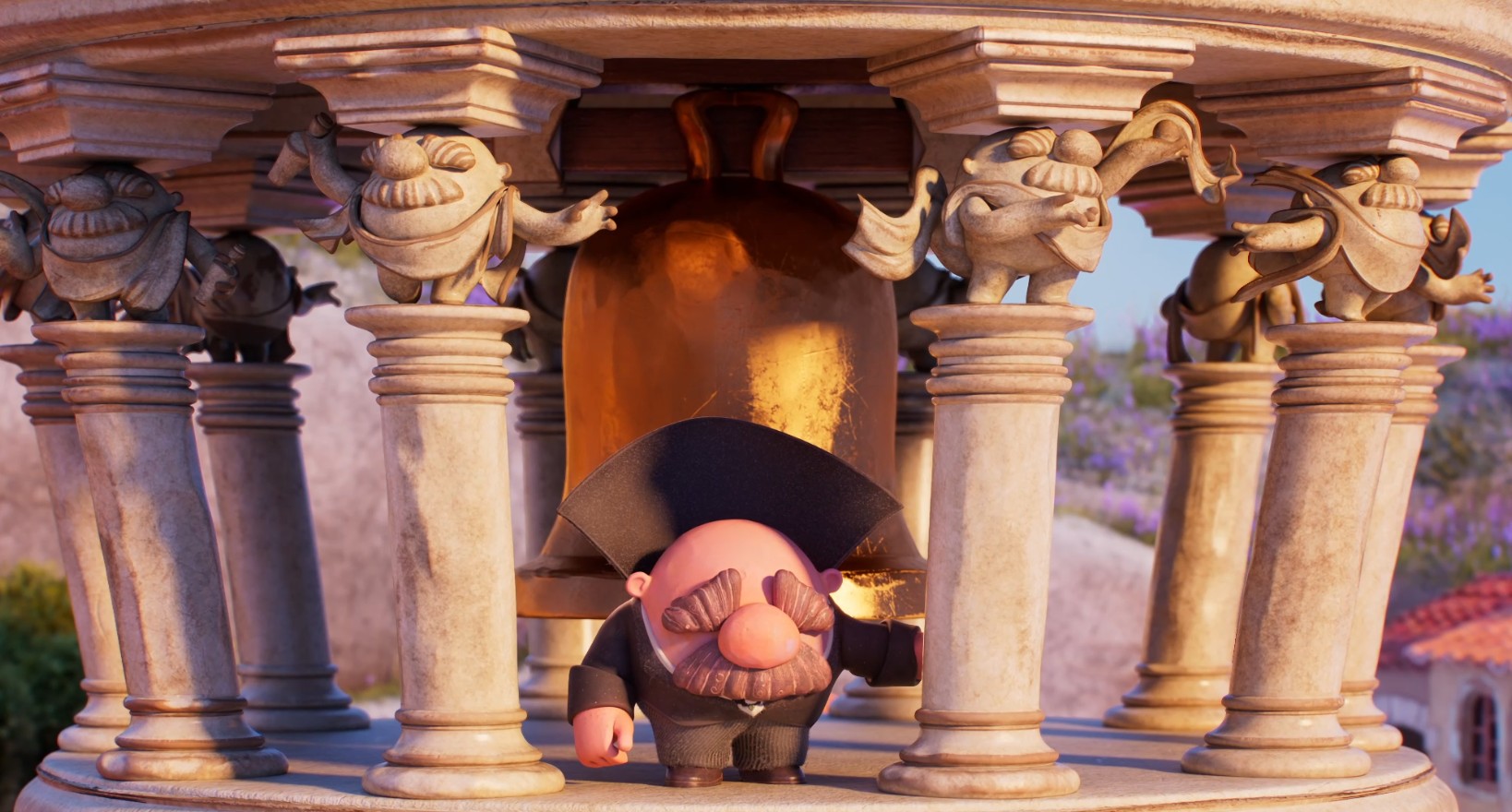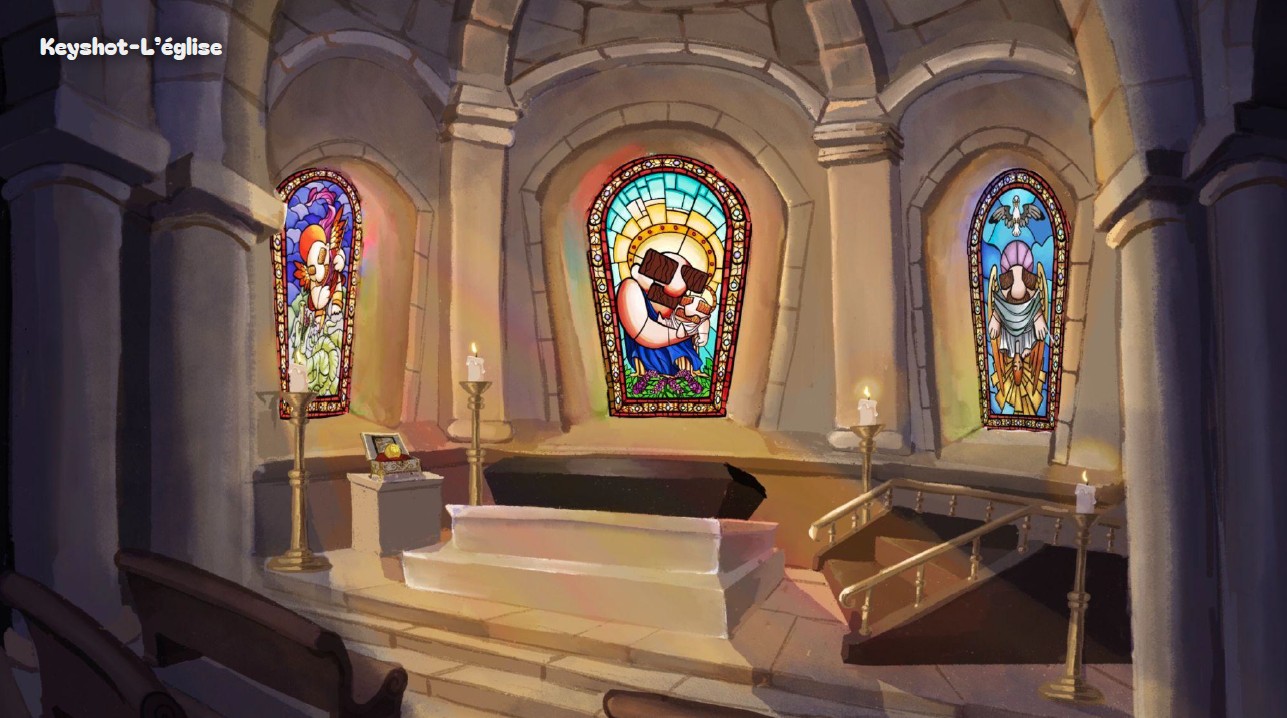 At the top of the church tower, Petru, armed with a fishing rod, throws a bottle of Pastis as bait. True to form in his clumsiness, he knocks the Marcels out of the church. He finally manages to steady the bottle and one Marcel bites into it like a fish.