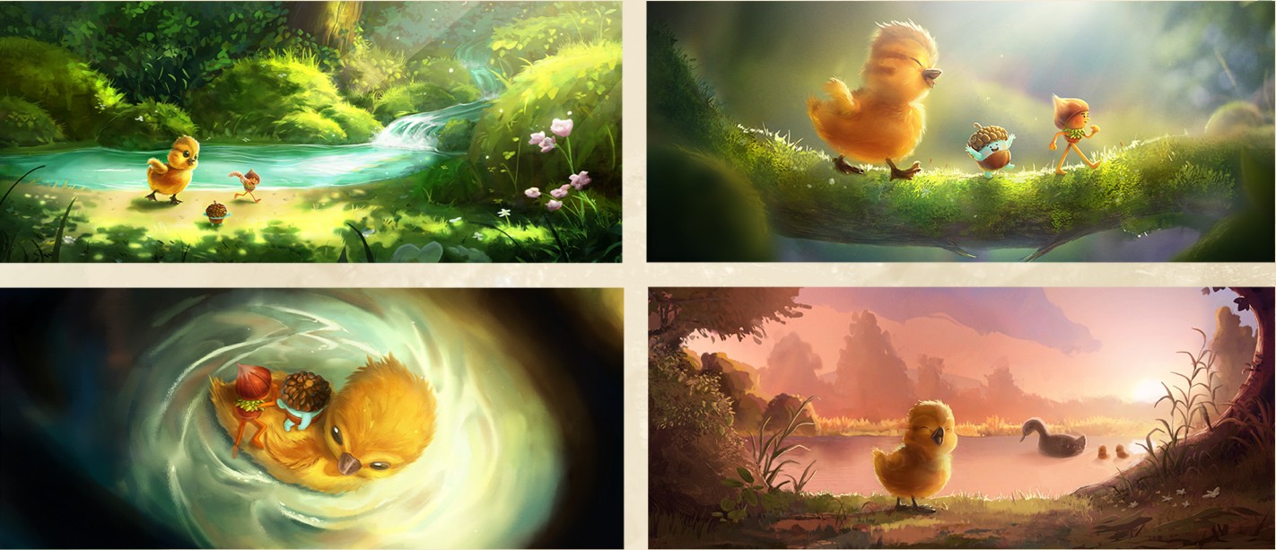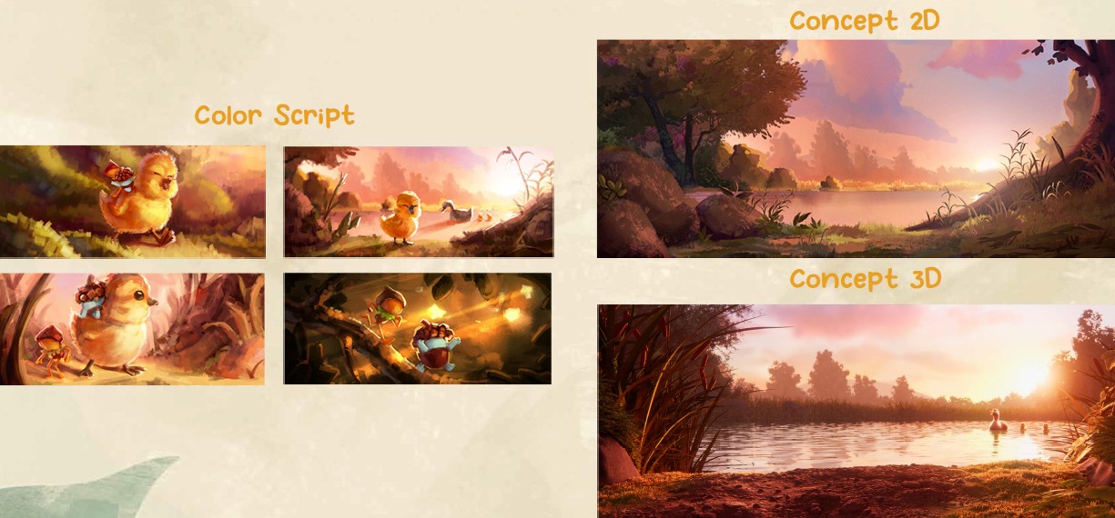 Pour le caneton, ainsi que pour le lever et le coucher de soleil, nous avions pris comme référence le court-métrage Piper, du studio Pixar.