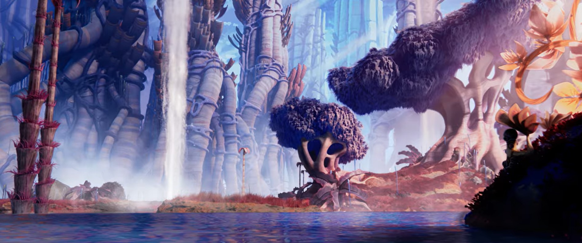 Tous deux vivent dans un monde d’une grande diversité, fruit d’un long travail de recherche de la part de l’équipe. “Le design des environnements choisis a pour objectif d’avoir une richesse de détail tout en apportant un sentiment grandiose et organique. Pour cela nous avons choisi de nous inspirer de trois univers en particulier : Le classique Princesse Mononoké pour la représentation forte de la nature ; la série HBO Scavengers Reign pour leur grande réussite qui consiste à avoir réussi à créer une planète extraterrestre à la fois complexe et organique ; enfin, la flore de Nausicaa et la vallée du vent, pour l’aspect « toxique » que ces plantes dégagent, qui nous permettent de faire le lien avec la thématique de l’environnement hostile, et de la maladie de Wilson.”
