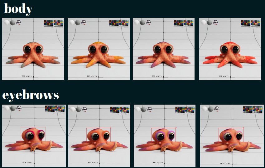 La psychologie de notre personnage a énormément influencé son apparence finale. Au fur et à mesure de l’écriture, nous avons pu déterminer si elle aurait un air plutôt adulte ou enfantin, la longueur de ses bras, sa couleur… Nous nous sommes inspirés notamment de Dory bébé pour l’attitude et l’apparence de notre personnage, que nous voulions très expressif.