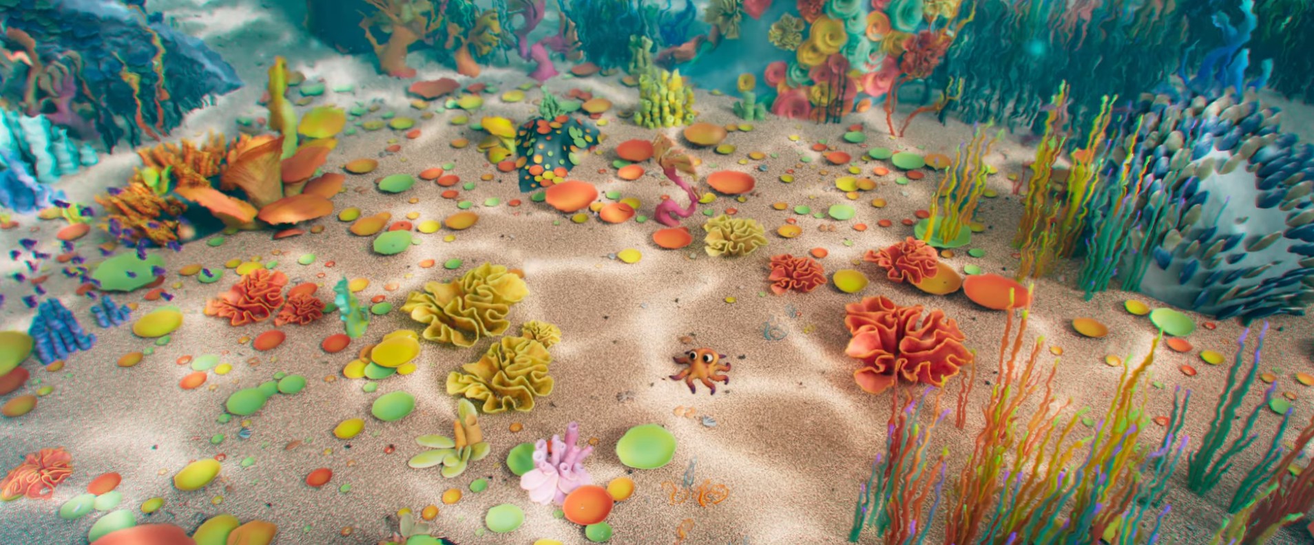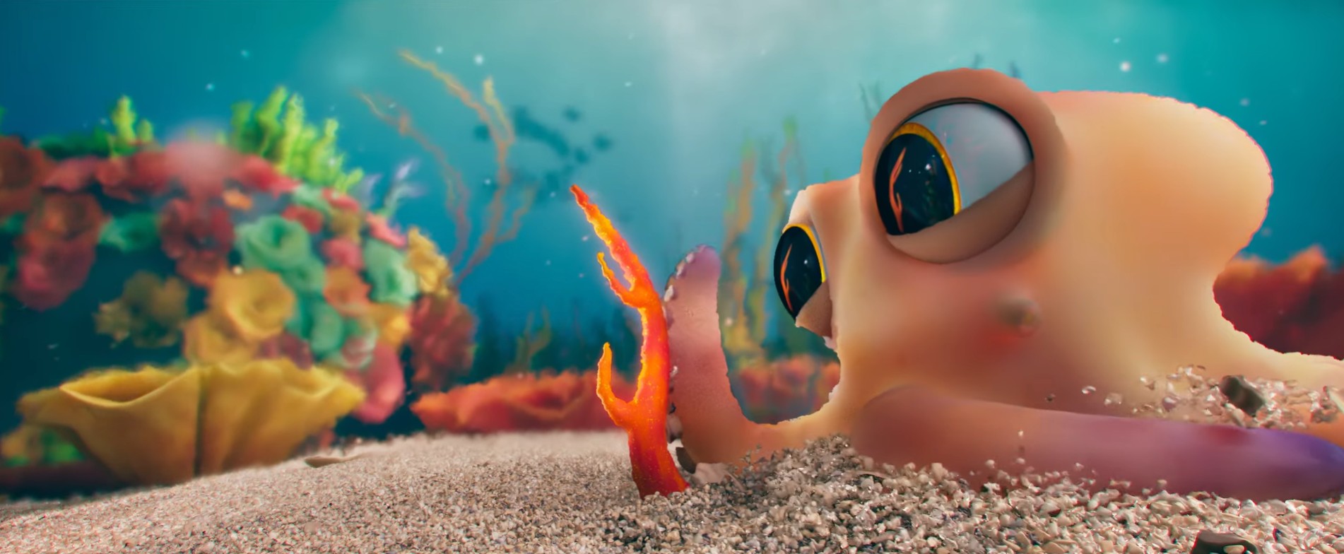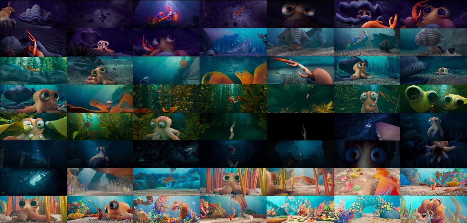 Ensuite, nous devions réussir à faire tenir un très grand nombre de plantes et d’animaux marins dans nos plans sans crasher continuellement. Et enfin, notre personnage principal étant un poulpe, cela ajoutait un défi supplémentaire en termes de rigging et d’animation.