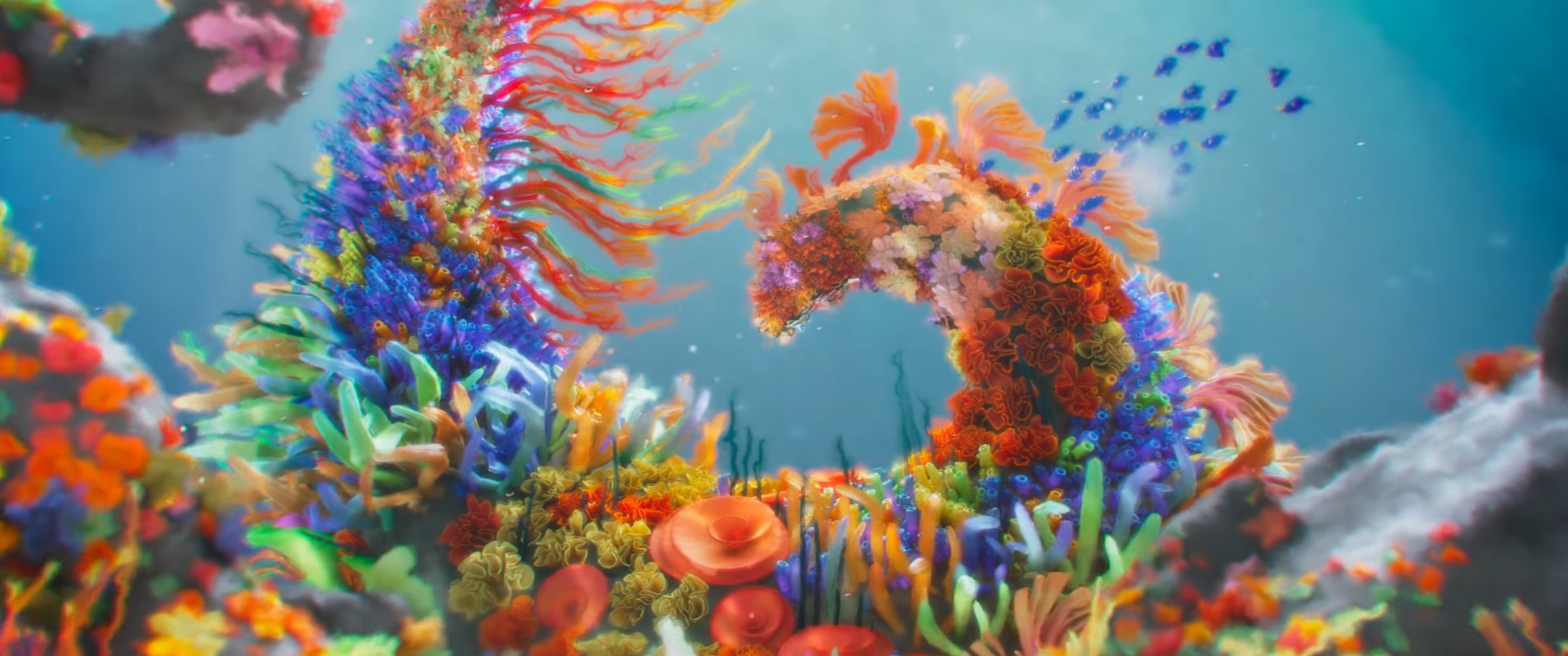 Au-delà de ce moment précis du film, nous avons rencontré trois défis principaux : D’abord, il fallait réussir à retranscrire la profondeur des fonds marins, tout en étant capables de montrer des objets situés loin en arrière-plan.