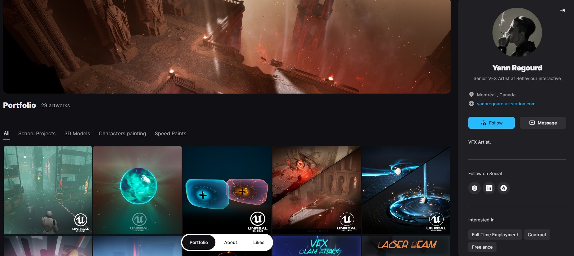 Je suis Senior VFX Artist dans un studio à Montréal. Mon rôle est de créer des effets spéciaux pour le jeu vidéo en temps réel, en suivant les orientations des directeurs artistiques et des game designers.