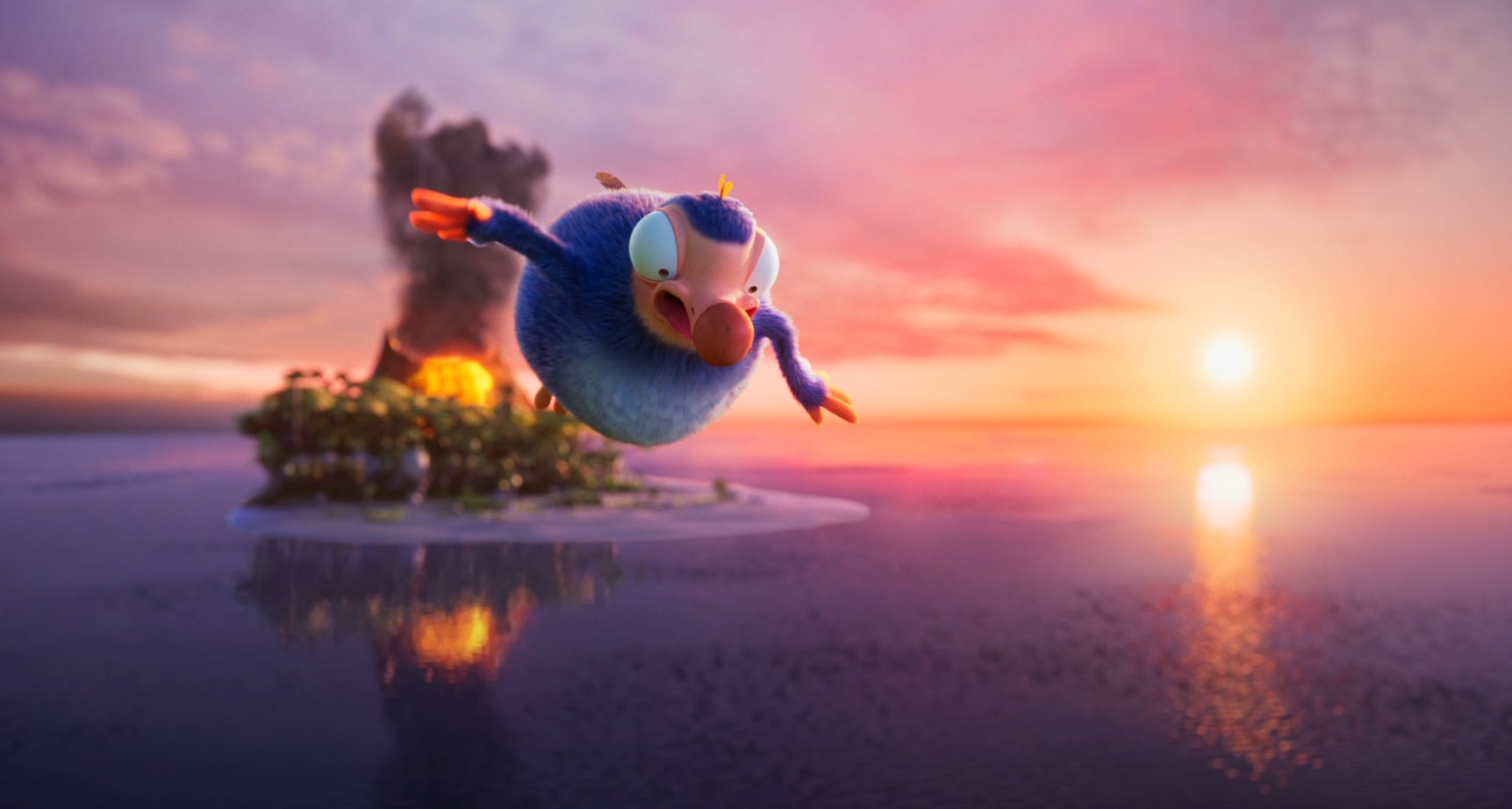 Le dodo porteur de la stèle, emporté par l’explosion, glisse à toute vitesse à travers l’île, poursuivi par la lave. Projeté dans les airs, il croit un instant avoir réussi, battant des ailes avec espoir. Mais la réalité le rattrape brutalement : la stèle finit engloutie par le requin, et le dodo, à bout de forces, chute une dernière fois dans l’océan.