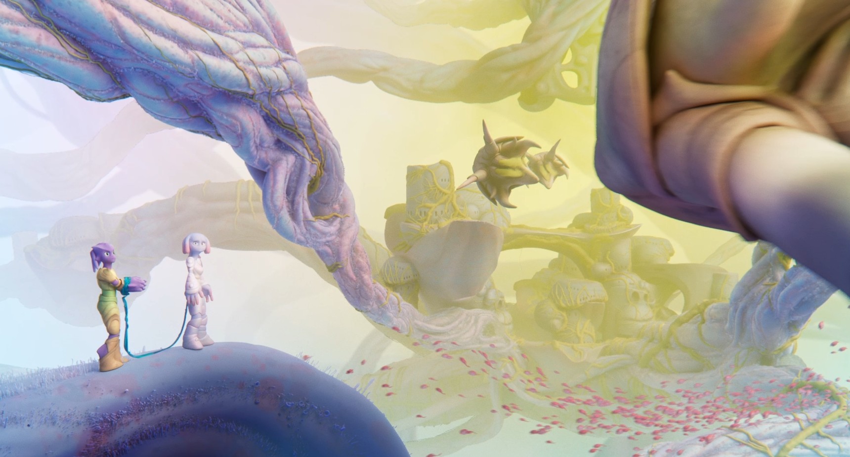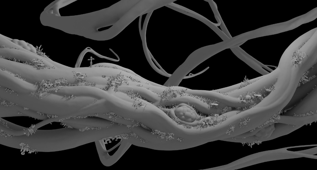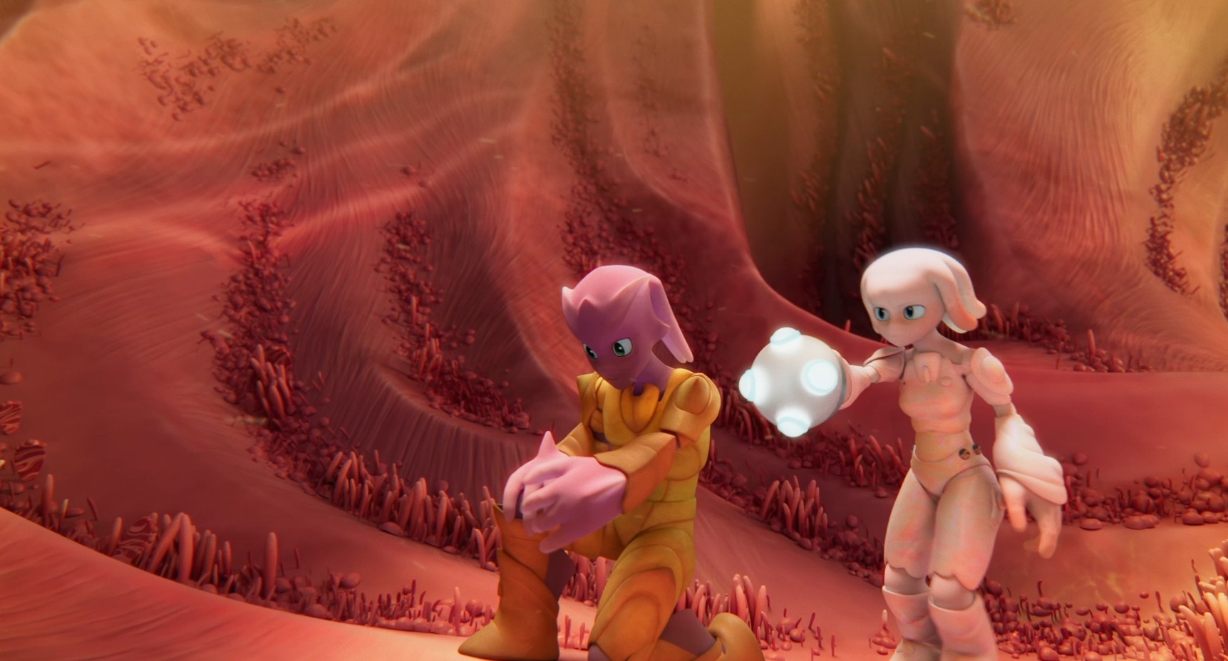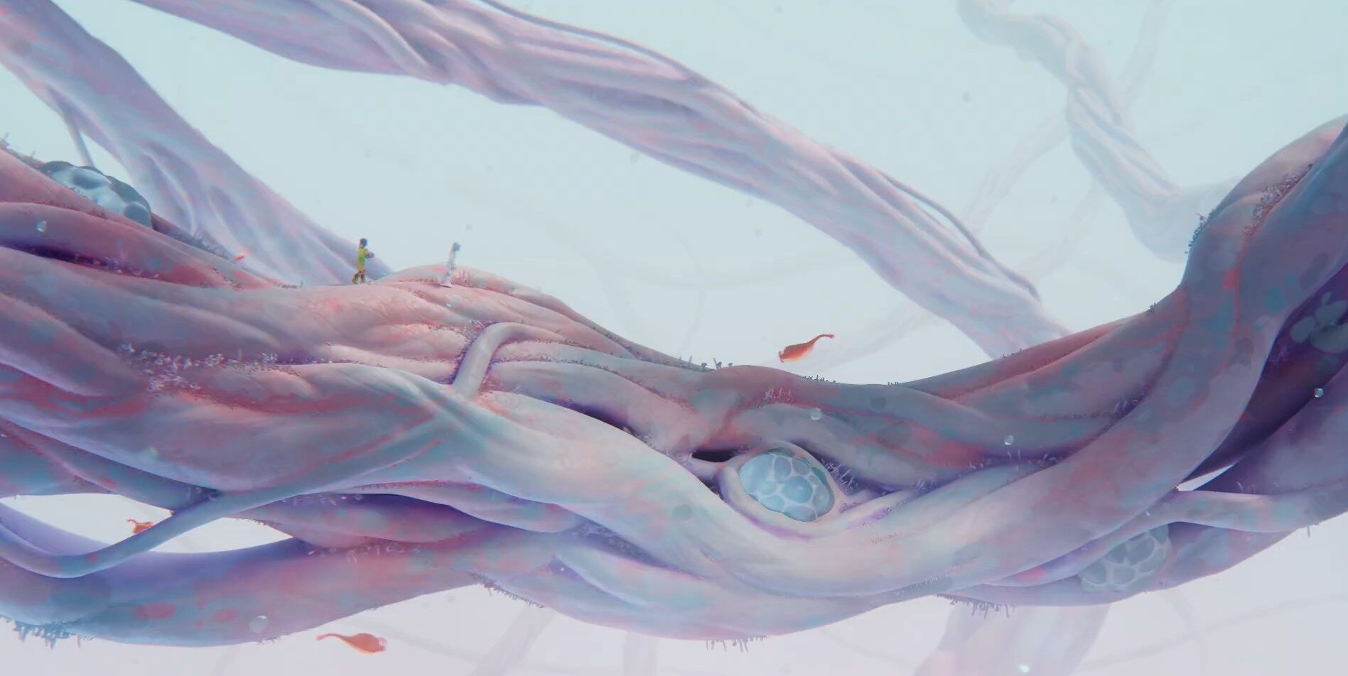 Épuisés, les deux personnages se rapprochent. Viruso, émerveillé par ce monde et par ce geste, pose sa tête sur l’épaule de Globula. Ils s’endorment.